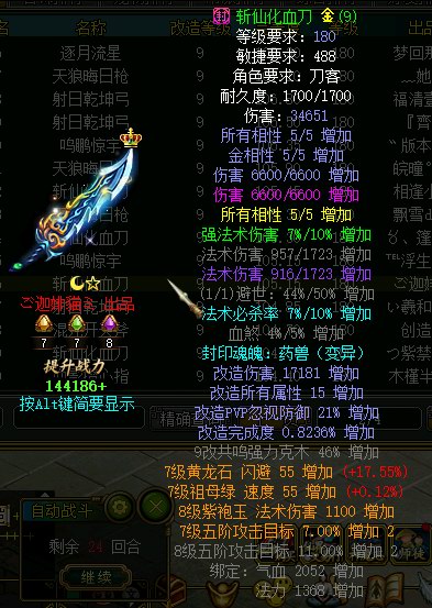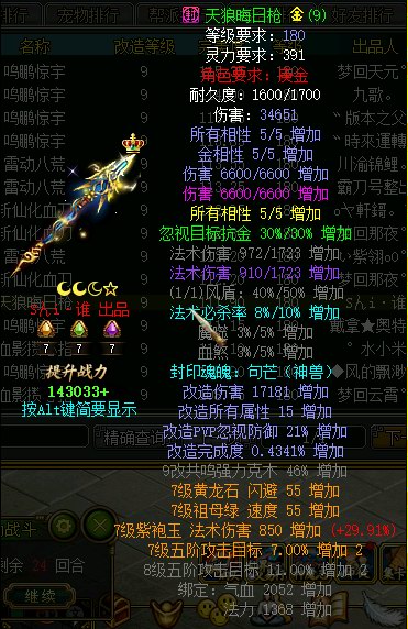 5、天狼晦日枪改9镶嵌7,绿满属性,紫属性风盾1/1。进入战斗随机获得物理吸收或法术吸收,日常、超级不可多得的属性。