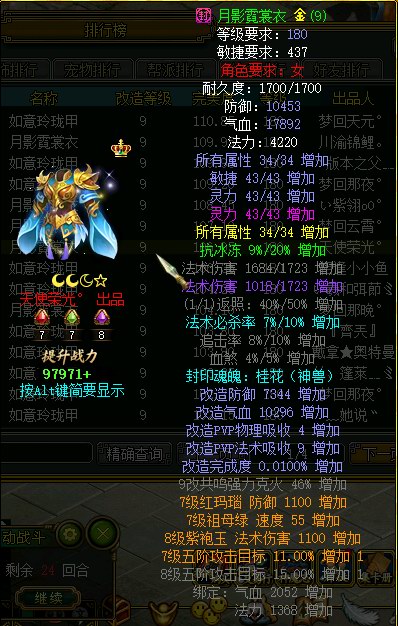 2、月影霓裳衣改9镶嵌7级,紫属性返照1/1,PK利器呀,再也不怕坐骑魂兽石飞天怒吼,滚鞍堕马了。复活时恢复被破坏的娃娃和坐骑状态。