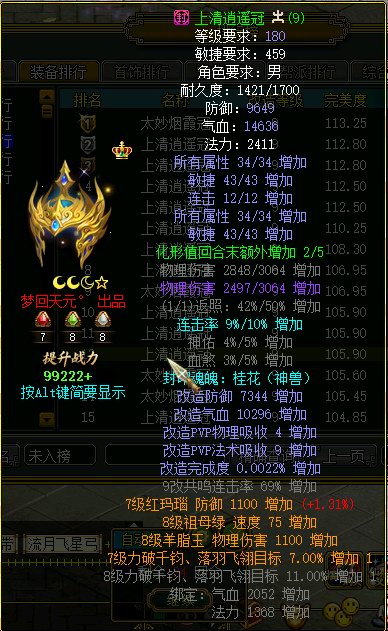 3、上清逍遥冠天然五满改9蓝属性,镶嵌7级。紫属性返照1/1。