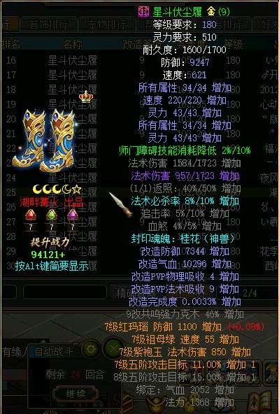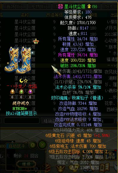 9、星斗伏尘履改9镶嵌8,紫属性遗惠1/1,宠物倒地增加角色物理吸收和法术吸收,体玩家带这属性会不会有奇效呢?