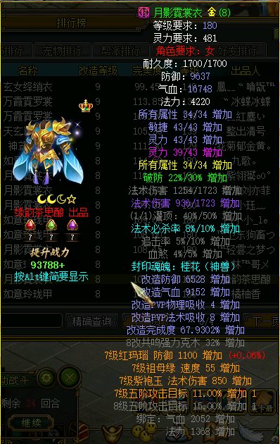 7、月影霓裳衣改8镶嵌7,紫属性灌顶1/1。需要玩家血量达到30W,这在之前很难,现在有转生药和先天道体给的血量加持,30W血量还是很简单的。