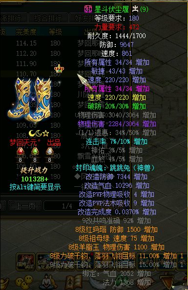 4、星斗伏尘履天然五满改9蓝装备,镶嵌7级。封印神兽,紫属性返照1/1。