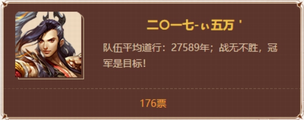 本期夺魁竞猜活动结果: 恭喜投票“二〇一七 - ぃ五万'”的玩家,共176位竞猜成功,共同瓜分100万银元宝!每人将获得5682银元宝(对应为90912000代金券)。