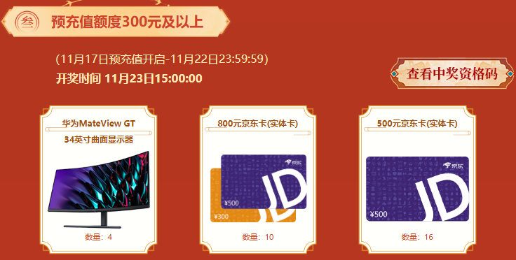 11月22日23:59前在新服累计充值达到300元还可参与第三阶段的抽奖,第三阶段奖品包括华为MateView GT 34英寸曲面显示器,800元京东卡(实体卡),500元京东卡(实体卡)。