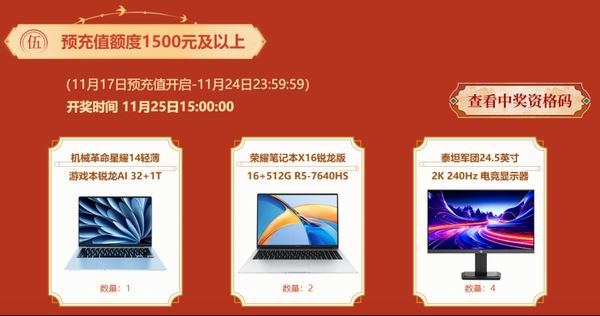 双线联运卡级轻享服“109”预充值大派送活动火爆进行中!活动共分为七个阶段,奖励包括京东卡、华为MateView GT 34英寸曲面显示器、机械革命无界14X 轻薄游戏本24+1T、华为Sound Joy 2智能蓝牙音箱、外星人AW920H 三模头戴式电竞耳麦、机械革命星耀14轻薄游戏本锐龙AI 32+1T、荣耀笔记本 X16锐龙版16+512G R5-7640HS、机械革命蛟龙16Pro电竞本RTX5060 32+1T 、机械革命苍龙16Ultra RTX5070Ti 32+1T等豪华数码大奖!千万不要错过~ 目前,阶段四累计充值800元的开奖结果已出,道友们可以登陆活动,查看自己的中奖情况及奖品。(请中奖道友尽快填写收件信息,截止到2025年12月05日23:59仍然未填写收件信息的则视为放弃奖励。) 11月24日23:59前在新服累计充值达到1500元还可参与第五阶段的抽奖,第五阶段奖品包括机械革命星耀14轻薄游戏本锐龙AI 32+1T,荣耀笔记本 X16锐龙版16+512G R5-7640HS,泰坦军团24.5英寸 2K 240Hz 电竞显示器。