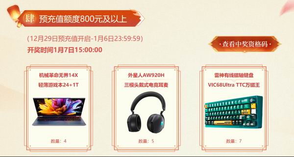 经典联运数字大服“2026”预充值大派送活动火爆进行中!活动共分为七个阶段,奖励包括京东卡、华为MateView GT 34英寸曲面显示器、机械革命无界14X 轻薄游戏本24+1T、外星人AW920H 三模头戴式电竞耳麦、雷神有线磁轴键盘VIC68Ultra TTC万磁王、机械革命星耀14轻薄游戏本锐龙AI 32+1T、机械革命无界14X斗战版2026 R7 16+512G、机械革命蛟龙16Pro电竞本RTX5060 32+1T、机械革命苍龙16Ultra RTX5070Ti 32+1T等豪华数码大奖!千万不要错过~ 目前,阶段三累计充值300元的开奖结果已出,道友们可以登陆活动,查看自己的中奖情况及奖品。(请中奖道友尽快填写收件信息,截止到2026年1月16日23:59仍然未填写收件信息的则视为放弃奖励。) 1月6日23:59前在新服累计充值达到800元还可参与第四阶段的抽奖,第四阶段奖品包括机械革命无界14X 轻薄游戏本24+1T,外星人AW920H 三模头戴式电竞耳麦,雷神有线磁轴键盘VIC68Ultra TTC万磁王。
