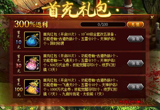 在新服“2026”首次创建角色后的前三天充值达到10元、30元、100元即可获得对应首充礼包。(如道友在开服前充值达到规定额度则必定会获得首充礼包。)点击游戏内左侧“首充礼包”图标即可领取奖励。奖励的首充红包有机会开出神兽(从上古神兽和五行神兽中随机)、神兽精魄、变异精魄、相性首饰。