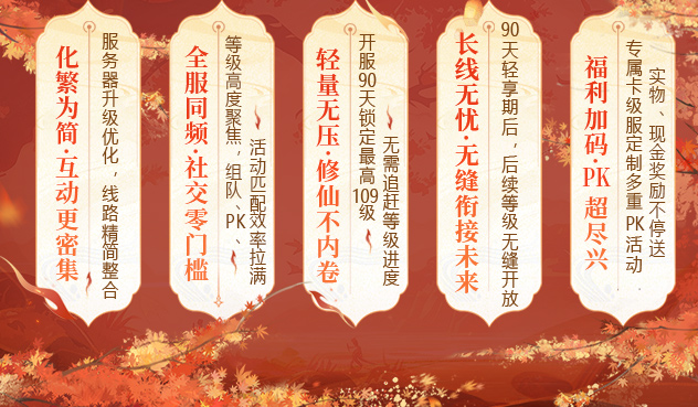 开服 90 天锁定最高 109 级,无需追赶等级进度。每日无需肝任务,茶余饭后就能解锁核心玩法,时间与金钱成本双双减负,轻松修仙不卷。