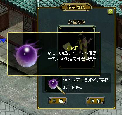 新增宠物点化系统,玩家在天墉城(120,169)的达闻散人处使用一个点化丹开启宠物点化后,可以通过给宠物喂养装备或道具点化丹来提升宠物灵气,随着宠物灵气提升,其成长值也会得到提升,点化成功后会得到给该宠物免费洗点一次的机会。
